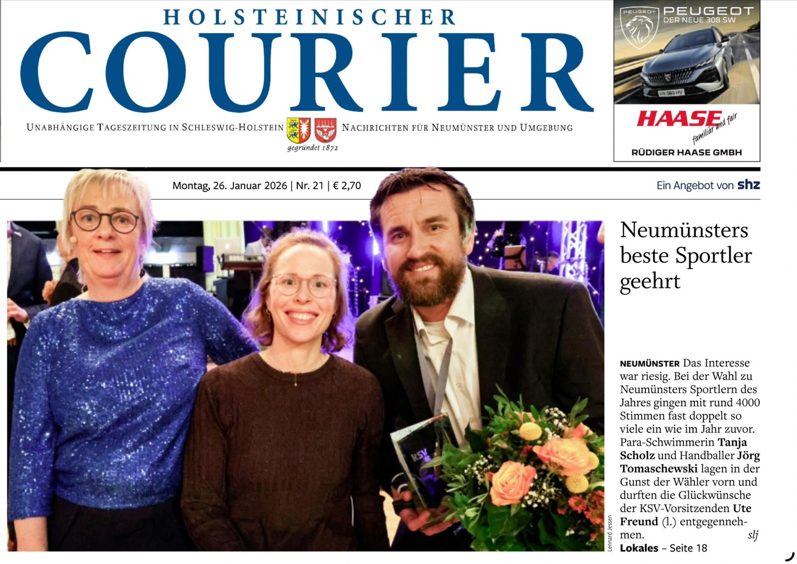 Auszug aus dem Holsteinischen Courier vom 05.12.2020. Unsere neuesten Artikel Das war der 46. Ball des Sports in Neumünster. 26. Januar 2026 2800 Gäste bei der Sportehrung für die besten Sportler*innen, Mannschaften und Talente der Stadt in der Holstenhalle. ... Sparkassse fördert Talente 5. Januar 2026 Das sind die Besten – Neumünster wählt die Sportler des Jahres 2025 4. Januar 2026 Der Kreissportverband Neumünster, der Holsteinische Courier (shz.de) und der Sportpool laden zur Wahl der Sportler des Jahres ...
