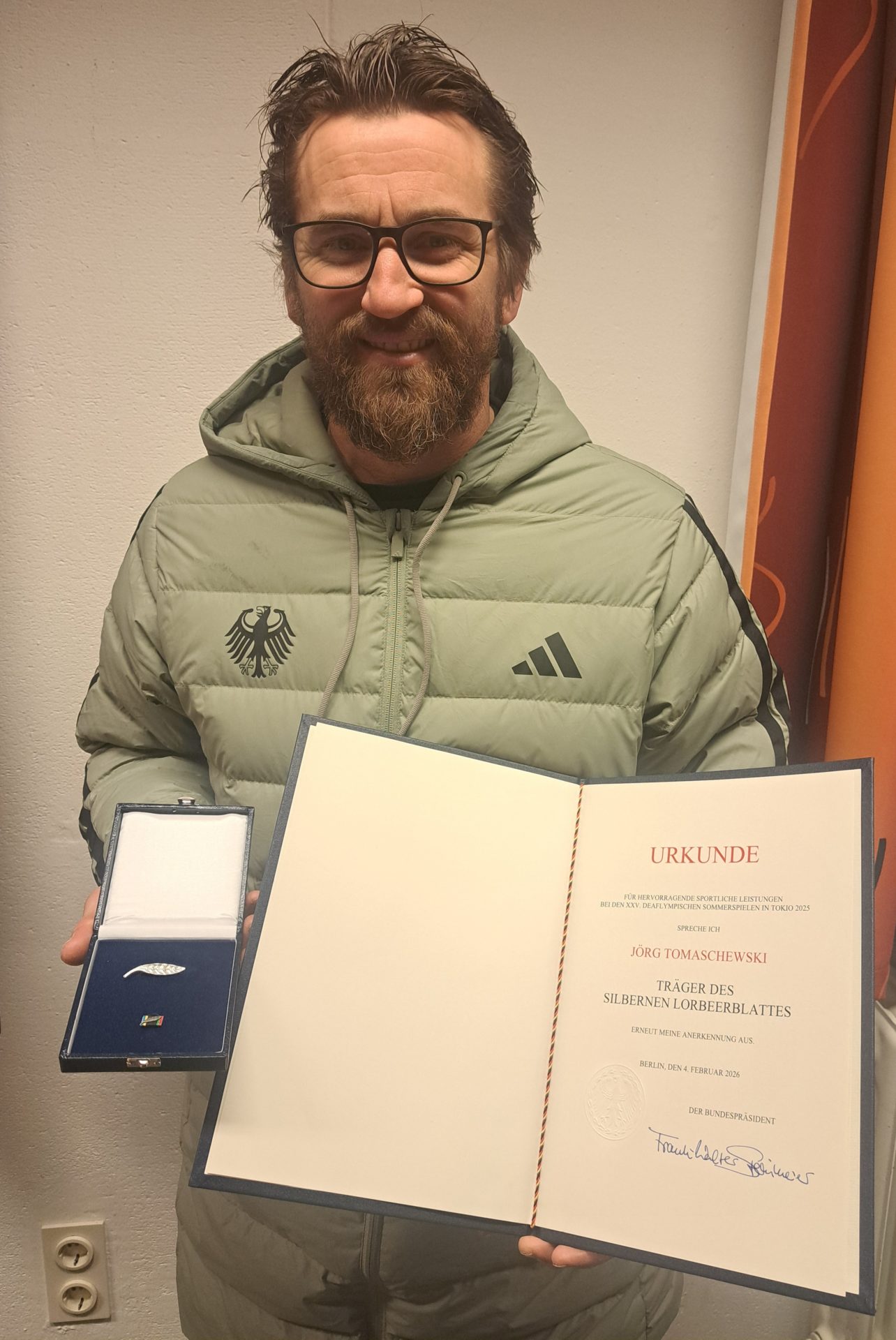 Jörg Tomaschewski durfte nach dem erfolgreichen Abschneiden und dem Gewinn der Silbermedaille bei den Deaflympics 2022 in Brasilien, nun zum zweiten Mal mit den „Deafboys“ nach Berlin reisen und das Silberne Lorbeerblatt in Empfang nehmen.
